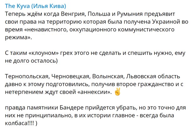 Одіозний проросійський депутат Верховної Ради від партії «Опозиційна платформа - За життя» (ОПЗЖ) Ілля Кива заявив, що Угорщина, Польща та Румунія можуть пред'явити права на деякі території, що увійшли до складу України за радянських часів.