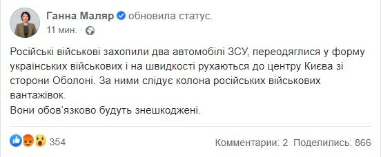 "Російські військові захопили два автомобілі ЗСУ, переодяглися у форму українських військових і на швидкості рухаються до центру Києва зі сторони Оболоні. За ними слідує колона російських військових вантажівок. Вони обов‘язково будуть знешкоджені", – пише Ганна Маляр.