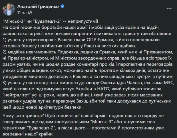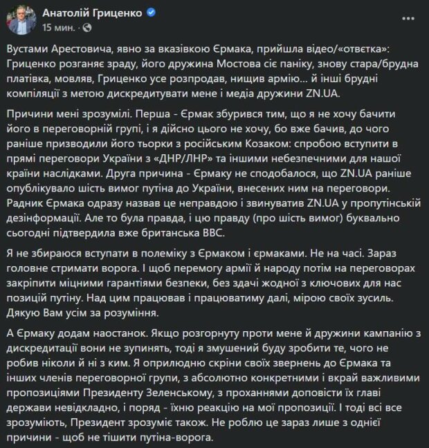 "Сьогодні вранці сталася подія, яка мене розлютила остаточно. Анатолій Гриценко, головний полковник всіх Збройних сил України, при каденції якого і пішло основне озброєння з ЗСУ, почав розповідати як правильно вести переговори і завив стару шарманку, що Єрмак все здає і Зеленський здає, я не витримав», - сказав Арестович.