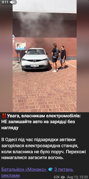 Мешканці Одеси були приголомшені займанням зарядної станції для електромобілів, коли власника автомобіля не було поряд. За словами очевидців, із зарядної станції раптово вирвався дим, що спонукало кількох перехожих спробувати загасити пожежу до прибуття екстрених служб.