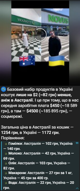Наприклад, кошик продуктів в Україні коштує 1172 грн, у той час як в Австралії — 1254 грн. У деяких випадках українські домогосподарства стикаються навіть із вищими витратами: літр молока коштує 69 грн проти 42 грн; курячі гомілки коштують 140 грн в Україні проти 102 грн в Австралії.