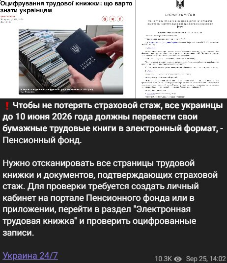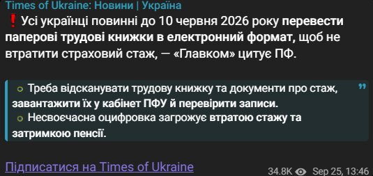 Пенсійний фонд України оголосив, що всі громадяни зобов'язані до 10 червня 2026 перевести свої паперові трудові книжки в електронний формат для збереження страхової історії.