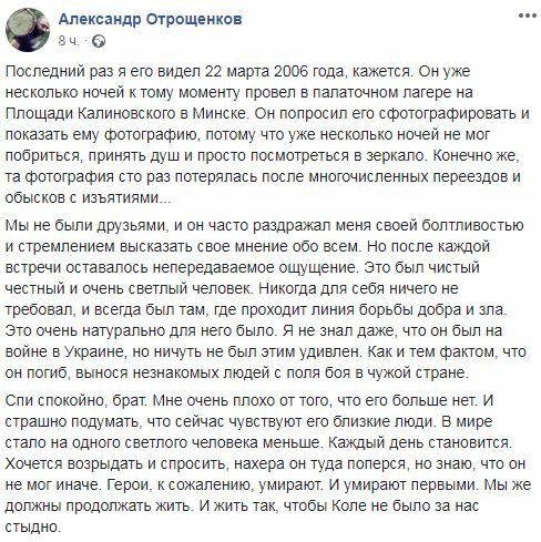 Спи спокійно, брате. Мені дуже погано від того, що його більше немає. І страшно подумати, що зараз відчувають його близькі люди. У світі стало на одну світлу людину менше. Щодня стає. Хочеться заридати й запитати, нахріна він туди поперся, але знаю, що він не міг інакше. Герої, на жаль, вмирають. І вмирають першими. Ми ж мусимо продовжувати жити. І жити так, щоб Колі не було за нас соромно", - написав Отрощенко.