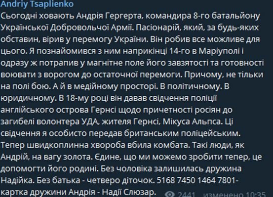 ПідписатисяГергерт пішов з життя 1 серпня. Відзначається, що на прощання з командиром, раніше - командира 8-го окремого батальйону "Аратта" Української Добровольчої Армії, прийшли сотні людей.