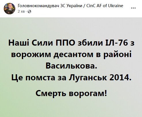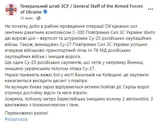 "С начала суток в районе проведения операции Объединенных сил зенитным ракетным комплексом С-300 Воздушных Сил ВС Украины сбит две вражеские цели – вертолет штурмовик Су-25 российских оккупационных войск. Также, истребитель Су-27 Воздушных Сил ВС Украины успешно атаковал военно-транспортный самолет Ил-76 МД российских оккупационных войск и уничтожил врага. Еще один Су-25 российских оккупантов, что летел в направлении Винницы, уничтожен украинским пилотом самолета Су-27. Сейчас продолжаются тяжелые бои в городе Васильков на Киевщине, где оккупанты пытаются высадить десант с воздуха. На улицах Киева сейчас происходят активные боевые действия. Везде враг получает достойный отпор и несет потери. В частности, вблизи метро Берестейская уничтожена колонна 2 автомобиля, 2 грузовика с боекомплектом и танк", – говорится в сообщении Генштаба ВСУ.