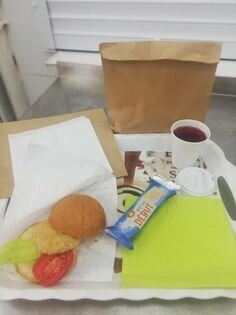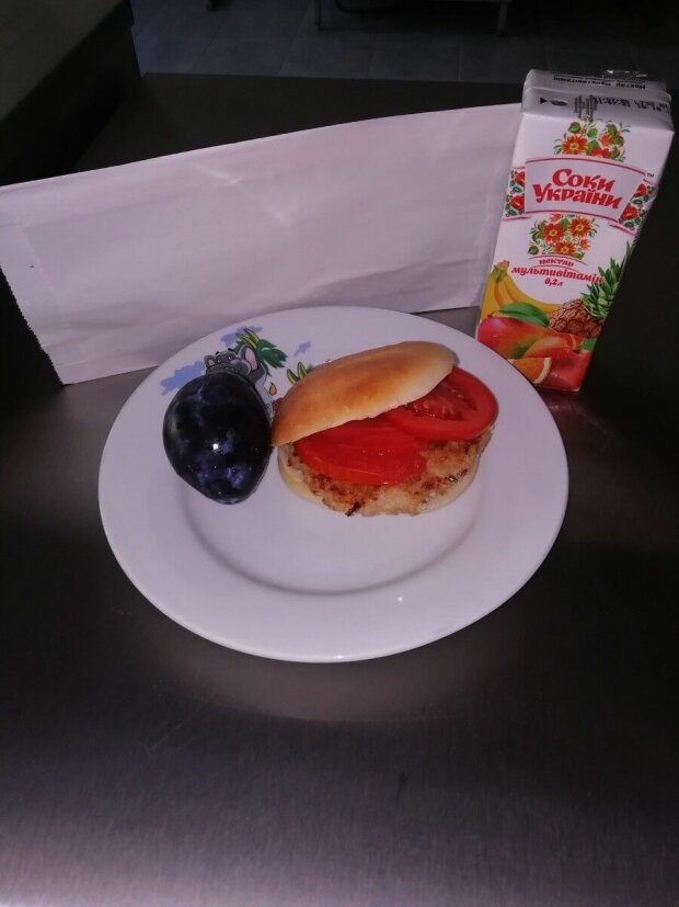 Впрочем родители сообщают что не везде все так плохо. Например, в школе №64 на 1 сентября был "бургер" без масла, банана не было, был сок, а 2 сентября блин с сыром и 1/4 яблока. Также родители отметили, что 2 сентября в гимназии №179 детям давали хороший завтрак. На фото виден бургер с салатом, слайсами томата и котлетой, а также вафли и напиток.