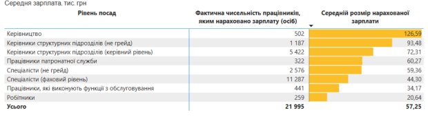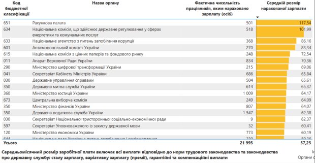 По данным Министерства финансов, в апреле в центральных государственных органах было занято 21 995 человек. Самый высокий заработок зафиксирован в Счетной палате, где сотрудники зарабатывали в среднем 117 500 гривен. В этом учреждении работает 501 человек.