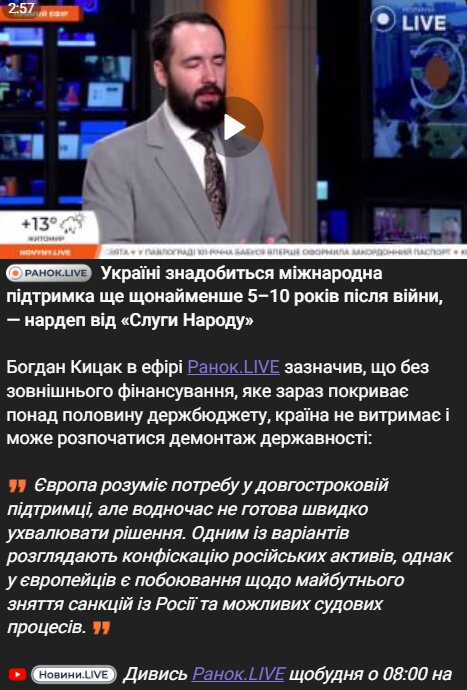 Народный депутат от фракции «Слуга народа» Богдан Кицак заявил в эфире программы «Ранок.LIVE», что Украина будет нуждаться в значительной внешней помощи как минимум в течение следующих пяти-десяти лет, даже после окончания войны.