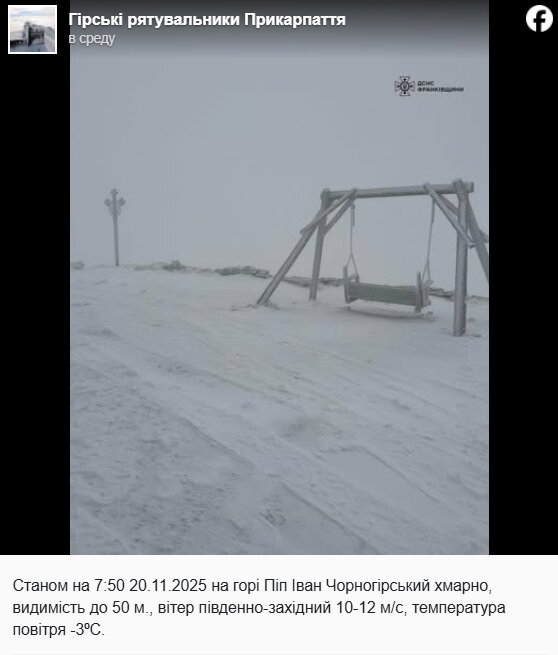ПодписатьсяТем временем в Карпатах продолжаются суровые погодные условия. По состоянию на 7:50 утра видимость на горе Поп Иван Черногорский составляла менее 50 метров из-за плотной облачности, а юго-западный ветер со скоростью 10–12 м/с усилил похолодание, температура опустилась до –3°C.