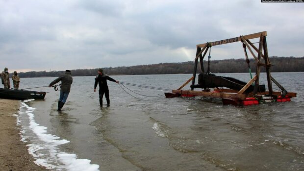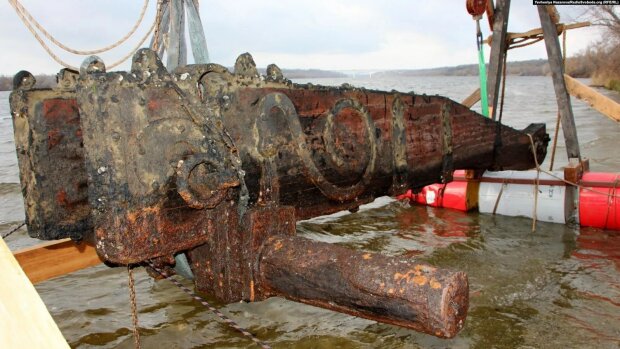 "Это полевая пушка. Она не использовалась на кораблях. Их только кораблями перевозили. Лафет сделан из дуба. Он общеевропейской конструкции. Где сделали, мы не знаем. Это может быть и Российская империя, и Украина, киевский Арсенал, и Вена. Даже английские лафеты могли попасть сюда", - рассказал руководитель отдела реставрации Национального заповедника "Хортица", гидроархеолог Валерий Нефедов.
